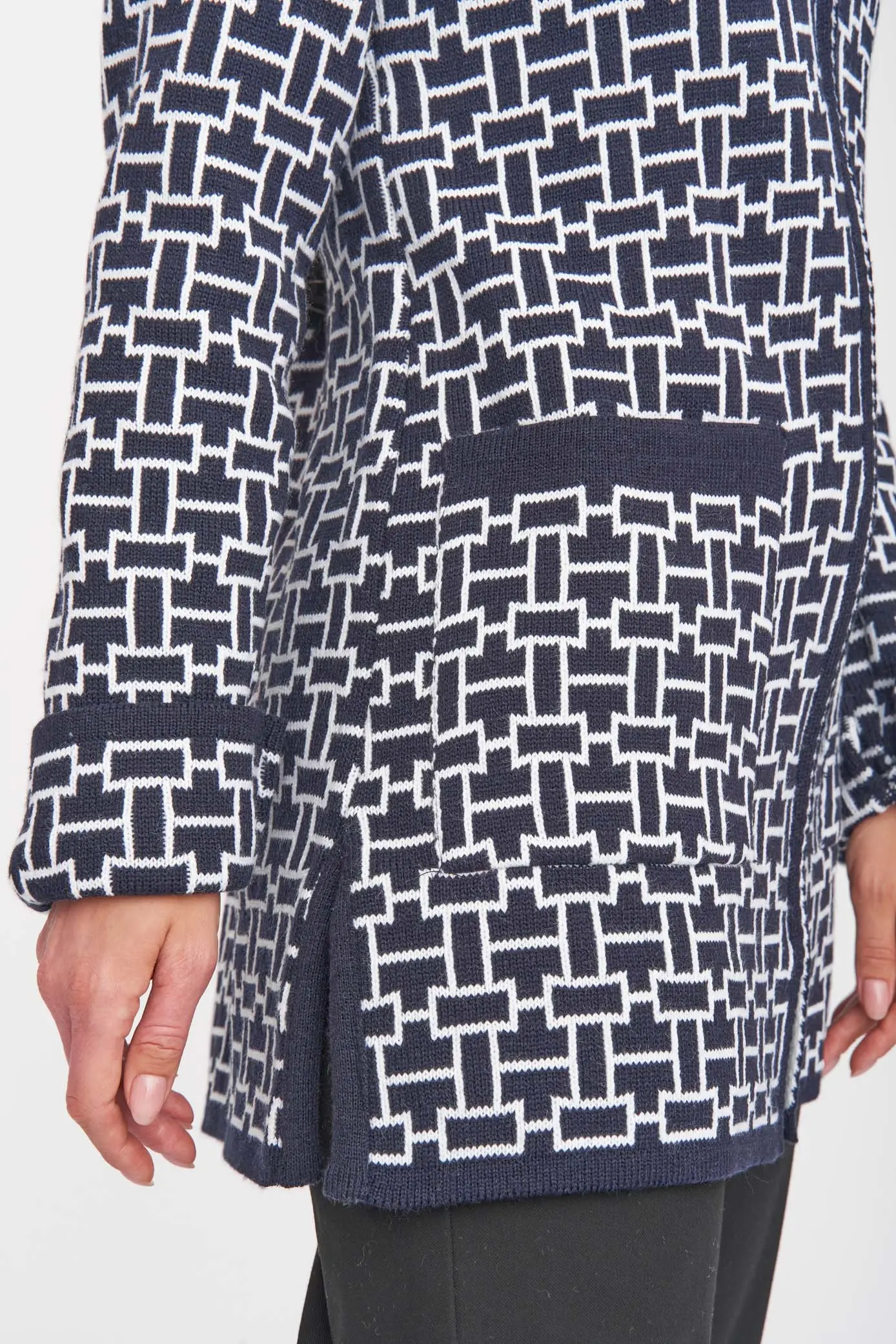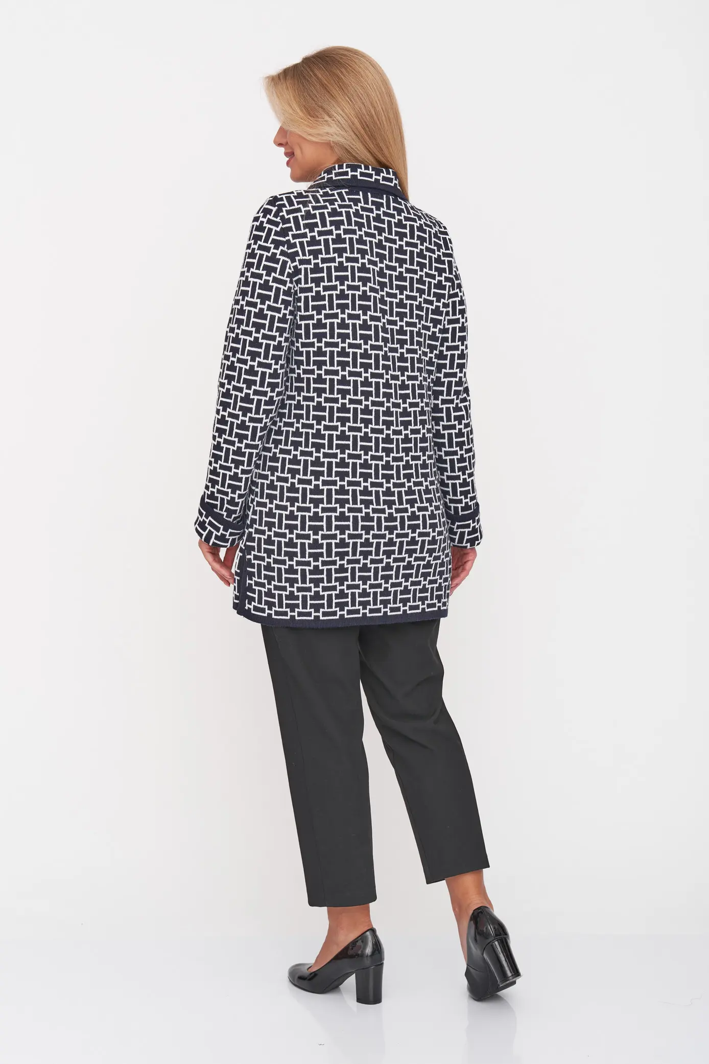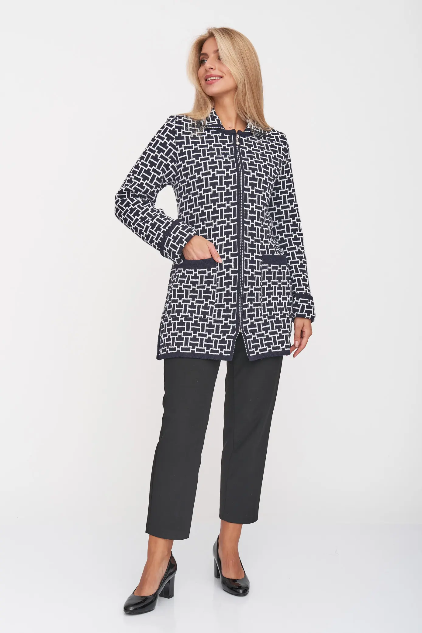 Женский эффектный вязанный жакет прямого силуэта. Жакет на молнии по всей длине изделия. Отложной контрастный воротник. Рукава втачные длинные. Два накладных кармана с контрастной отделкой. Жакет выполнен жаккардовым переплетением образующим геометрический рисунок.