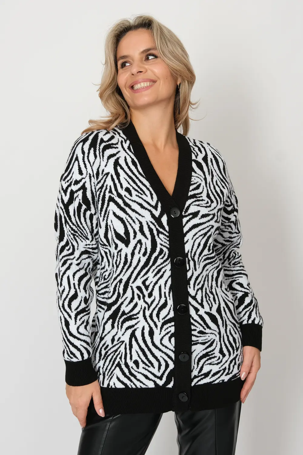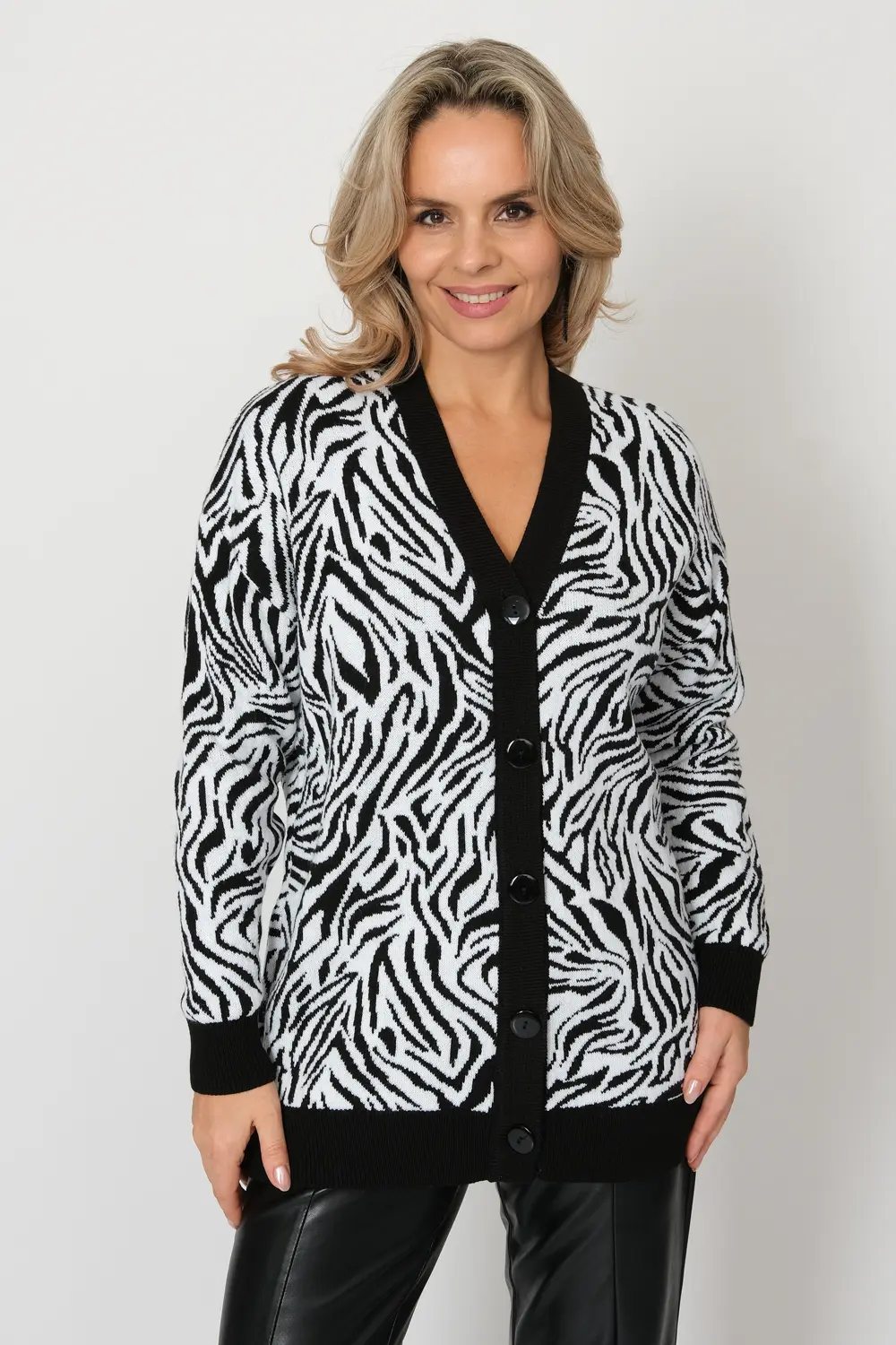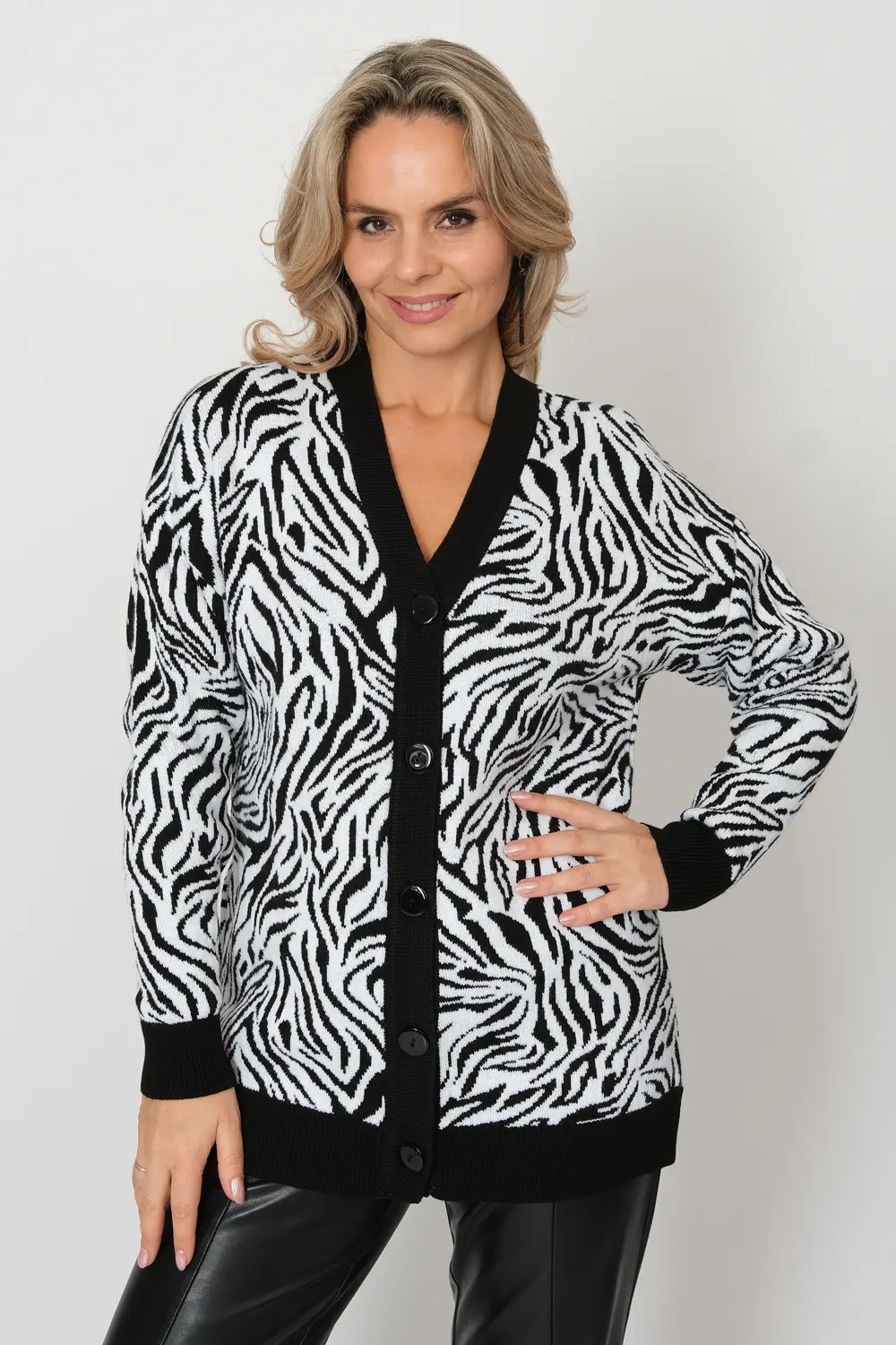 Вязаный женский жакет свободного силуэта. Плечо спущенное, рукава втачные длинные. Жакет застегивается на пуговицы, образуя V-образный вырез горловины. Жакет выполнен жаккардовым переплетением с анималистическим рисунком. Низ изделия и манжеты выполнены эластичным переплетением.