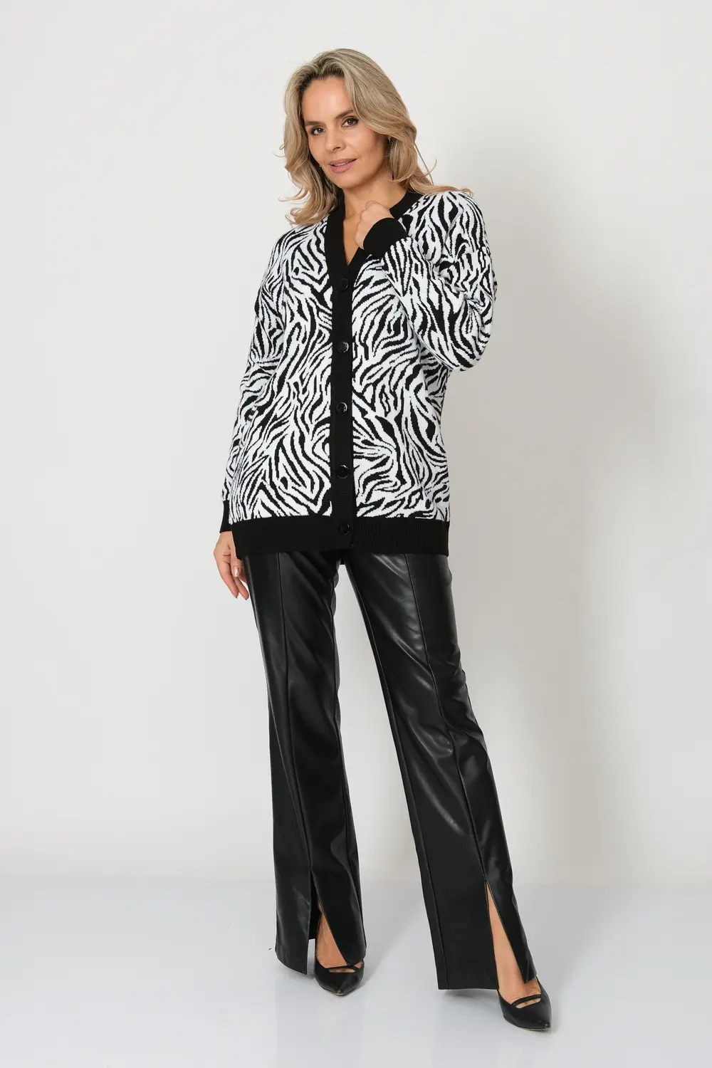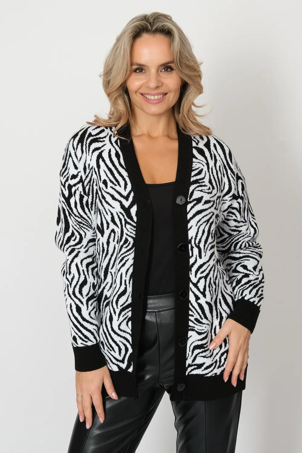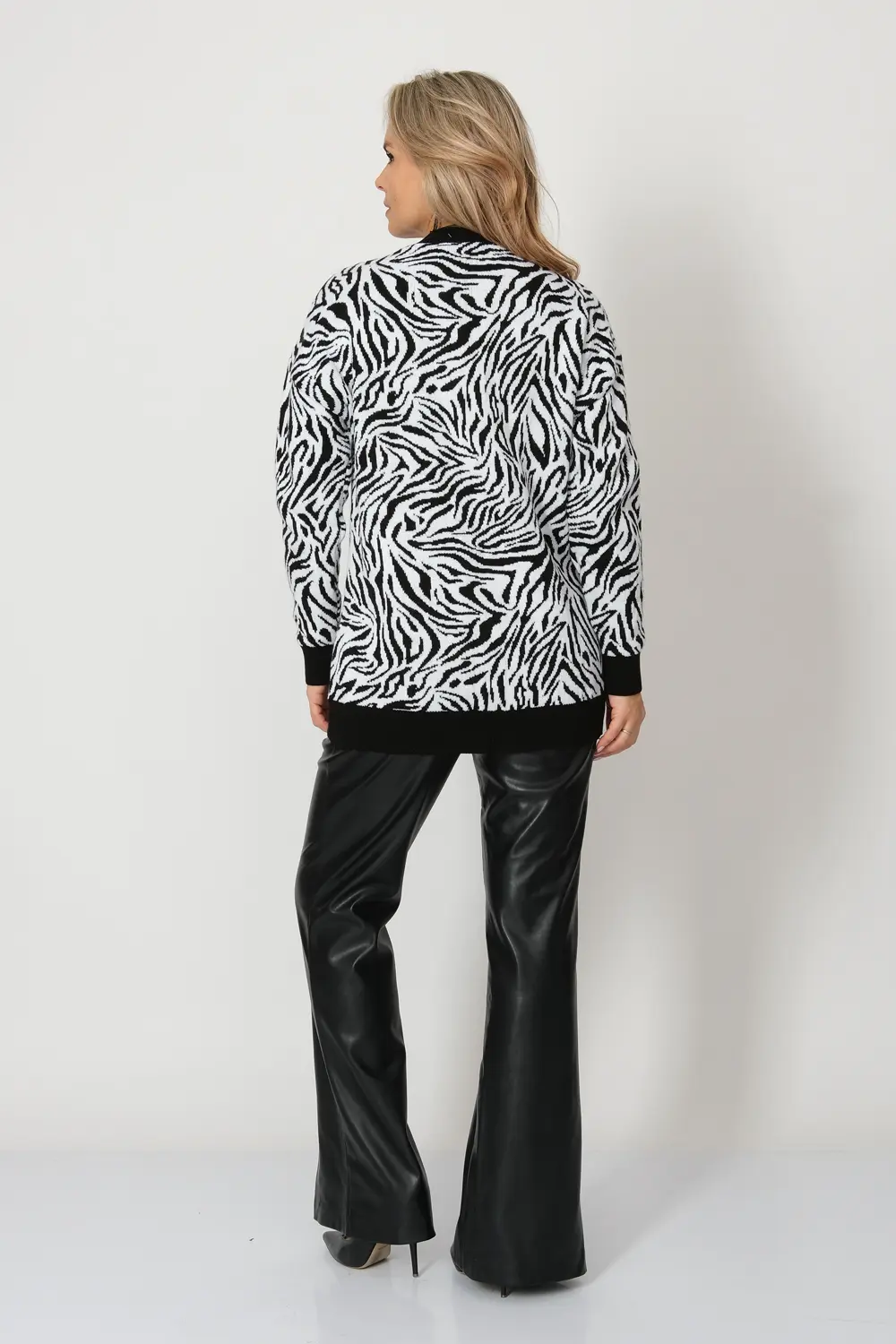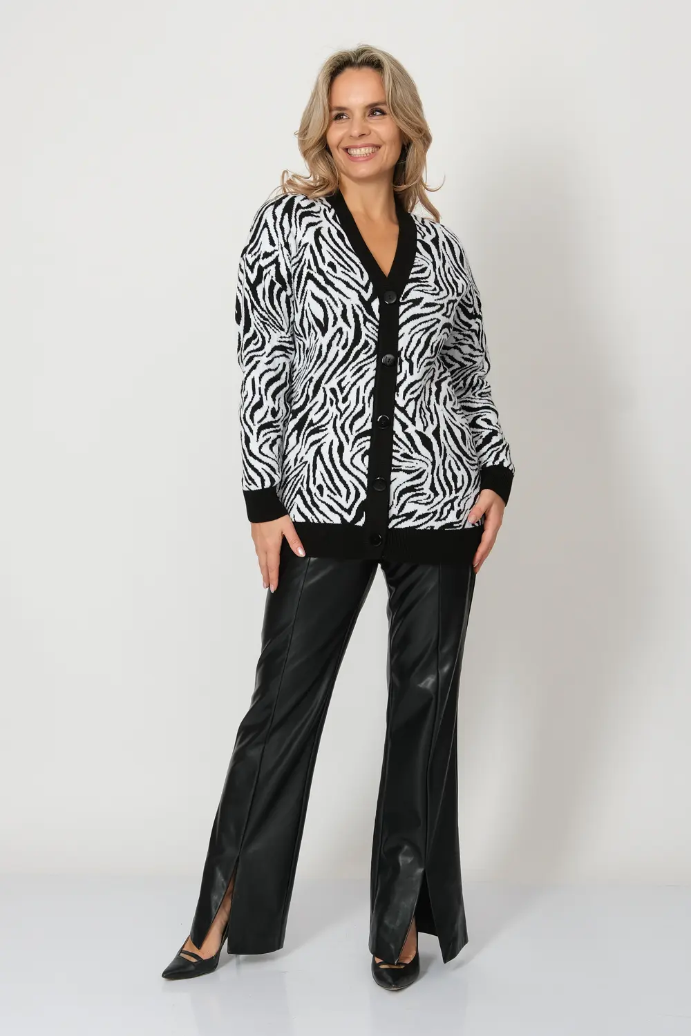 Вязаный женский жакет свободного силуэта. Плечо спущенное, рукава втачные длинные. Жакет застегивается на пуговицы, образуя V-образный вырез горловины. Жакет выполнен жаккардовым переплетением с анималистическим рисунком. Низ изделия и манжеты выполнены эластичным переплетением.