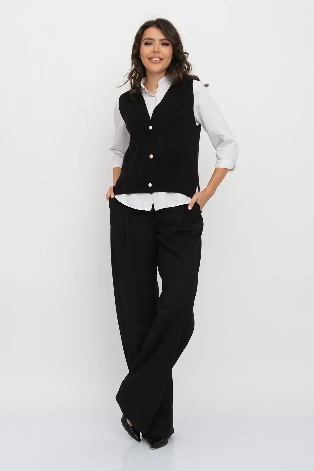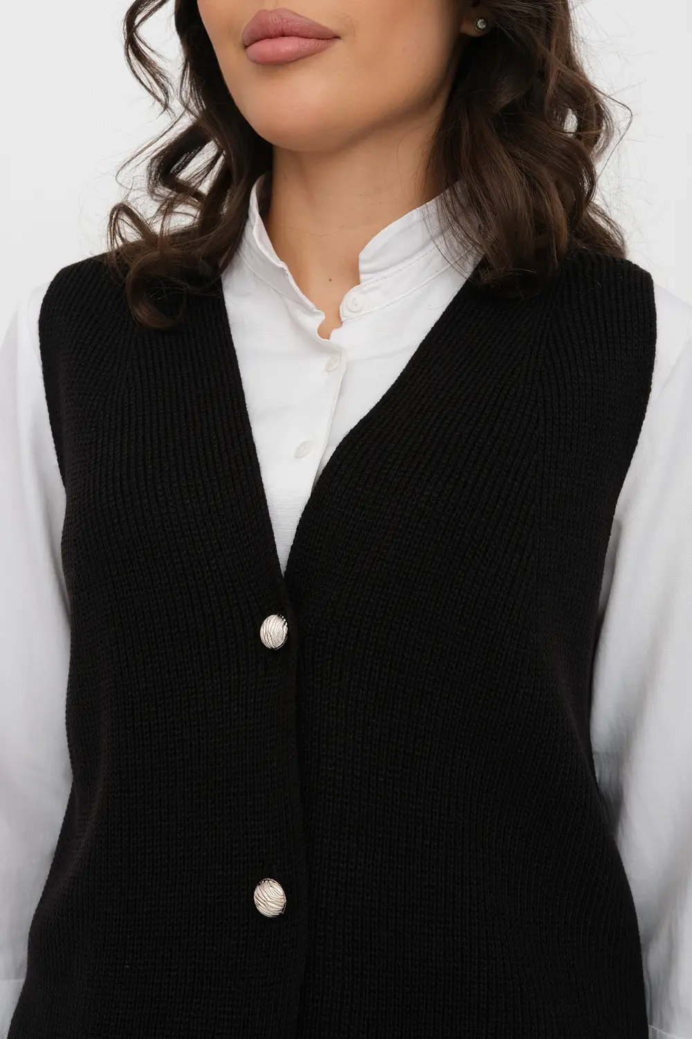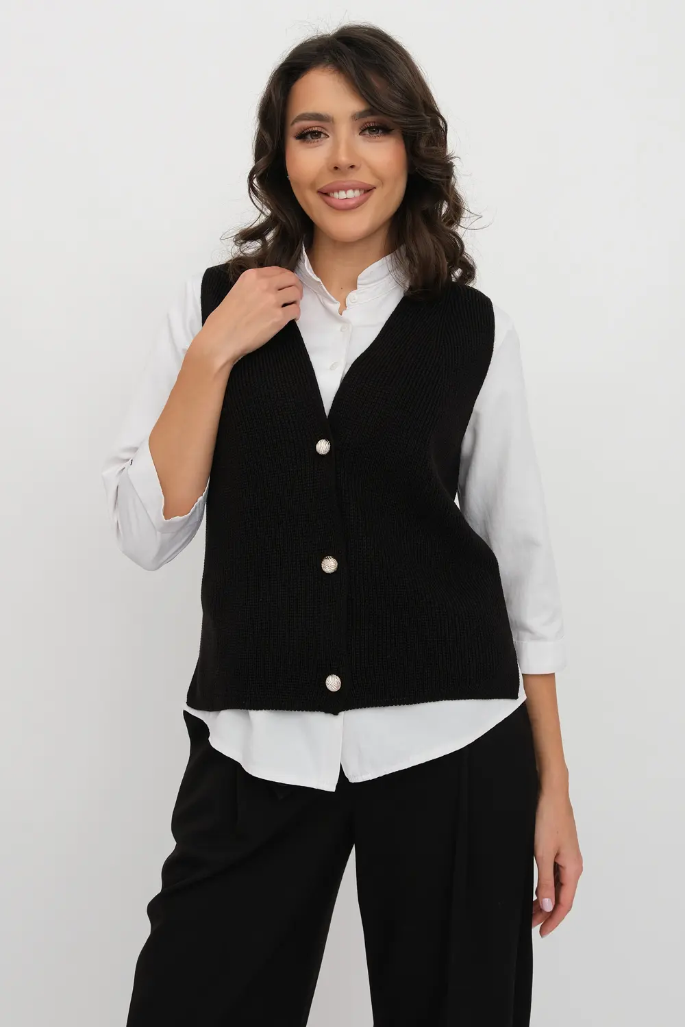 Классический женский жилет на трех пуговицах. Связан гладким переплетением. Отлично смотрится как с классической рубашкой, блузкой, водолазкой, так и с молодежным лонгсливом или футболкой.