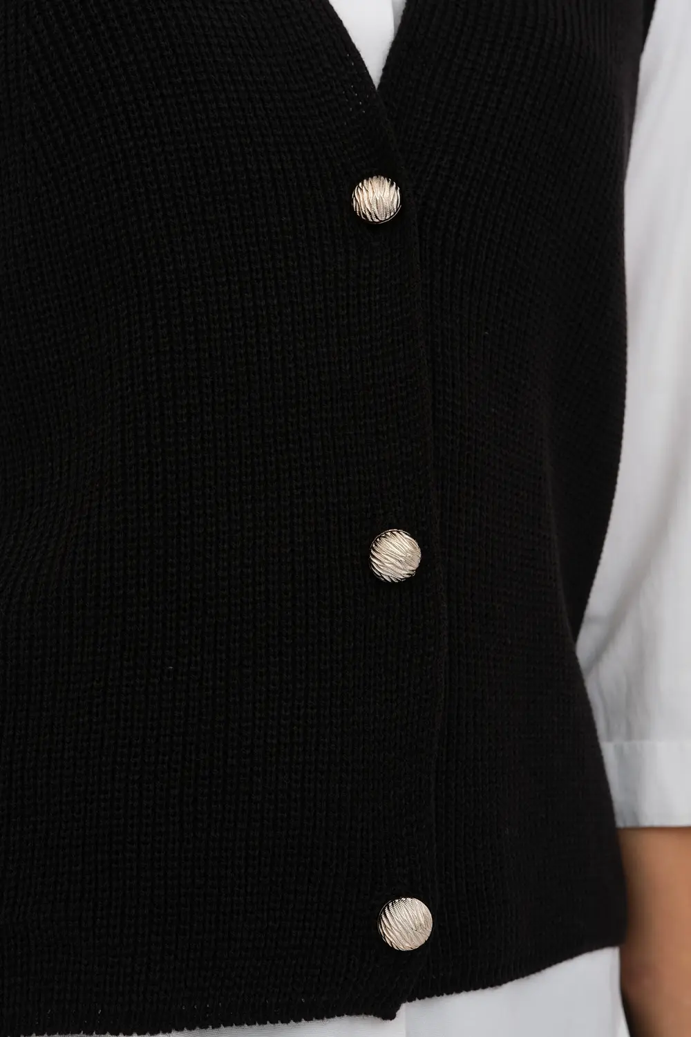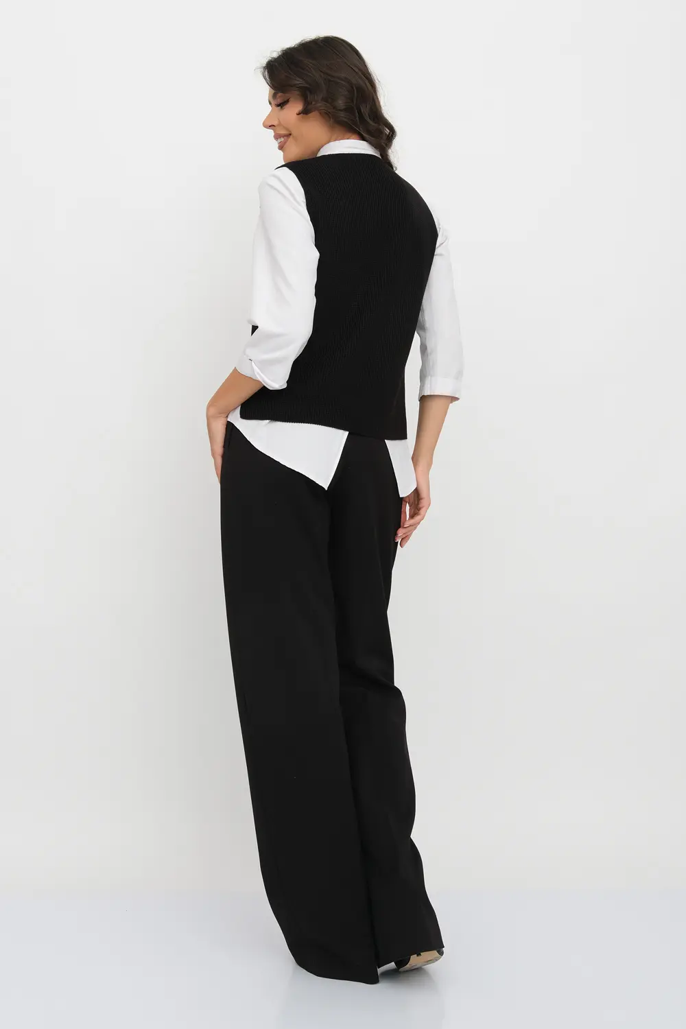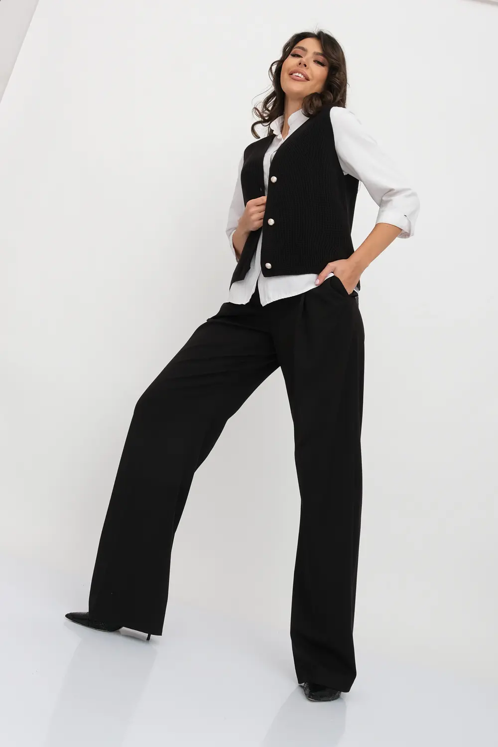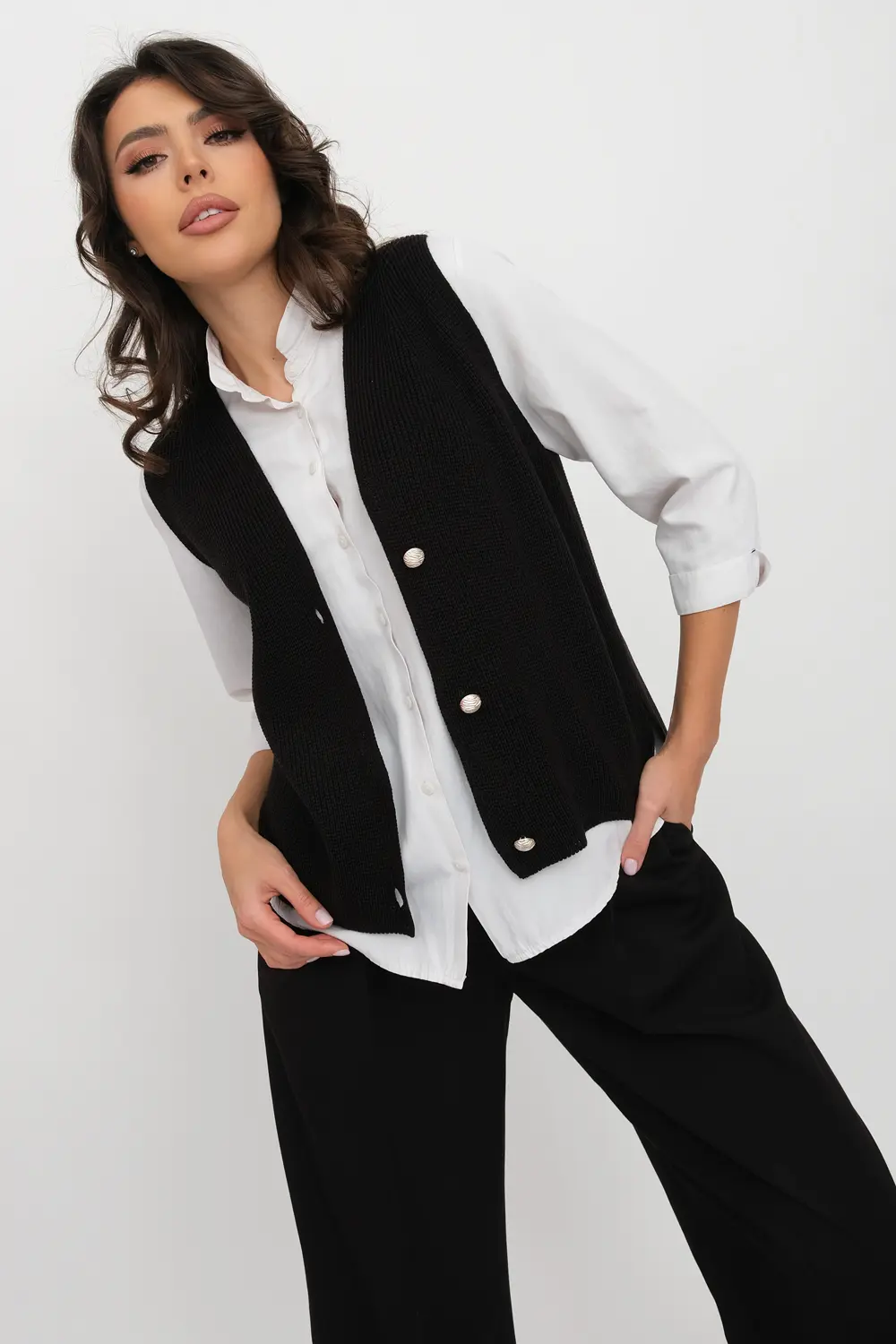 Классический женский жилет на трех пуговицах. Связан гладким переплетением. Отлично смотрится как с классической рубашкой, блузкой, водолазкой, так и с молодежным лонгсливом или футболкой.